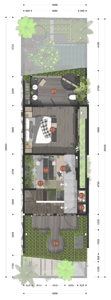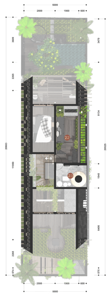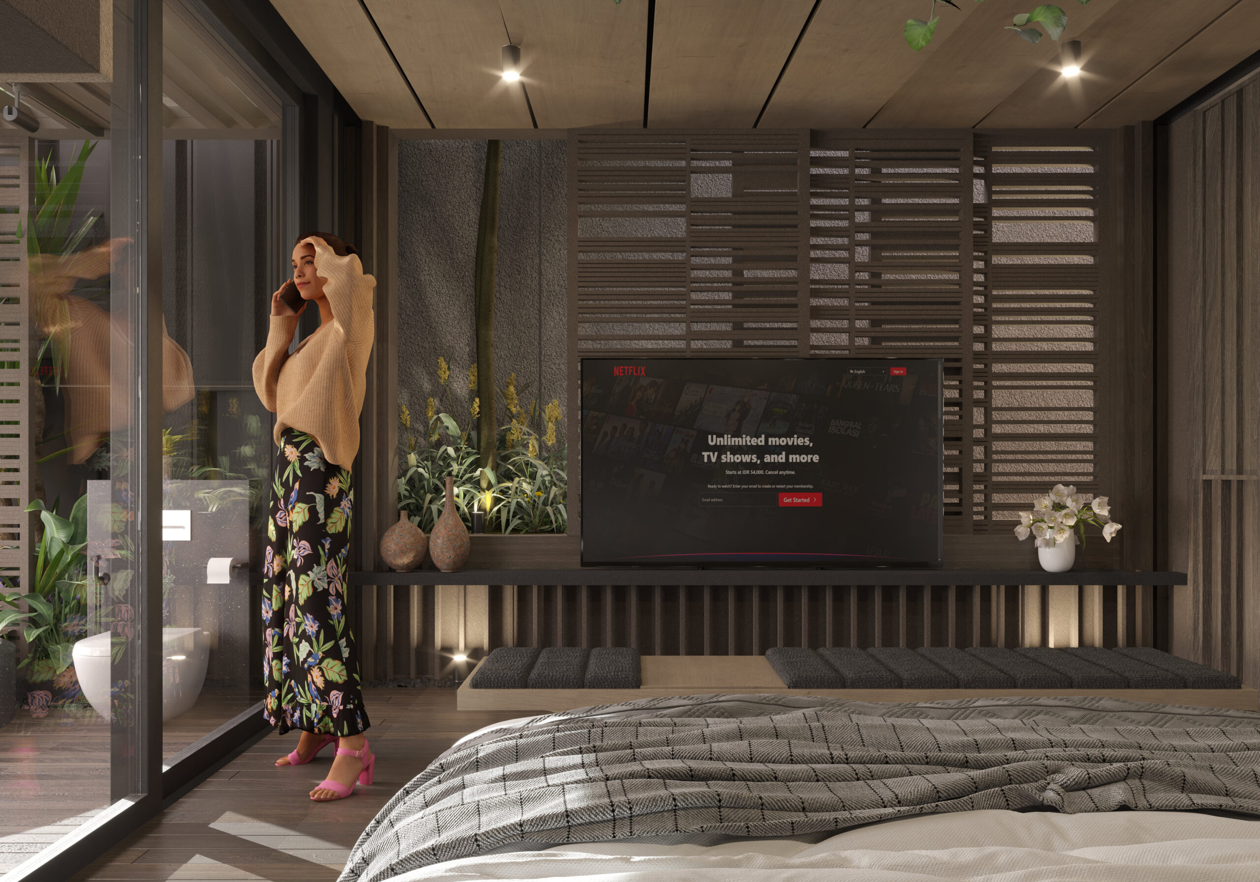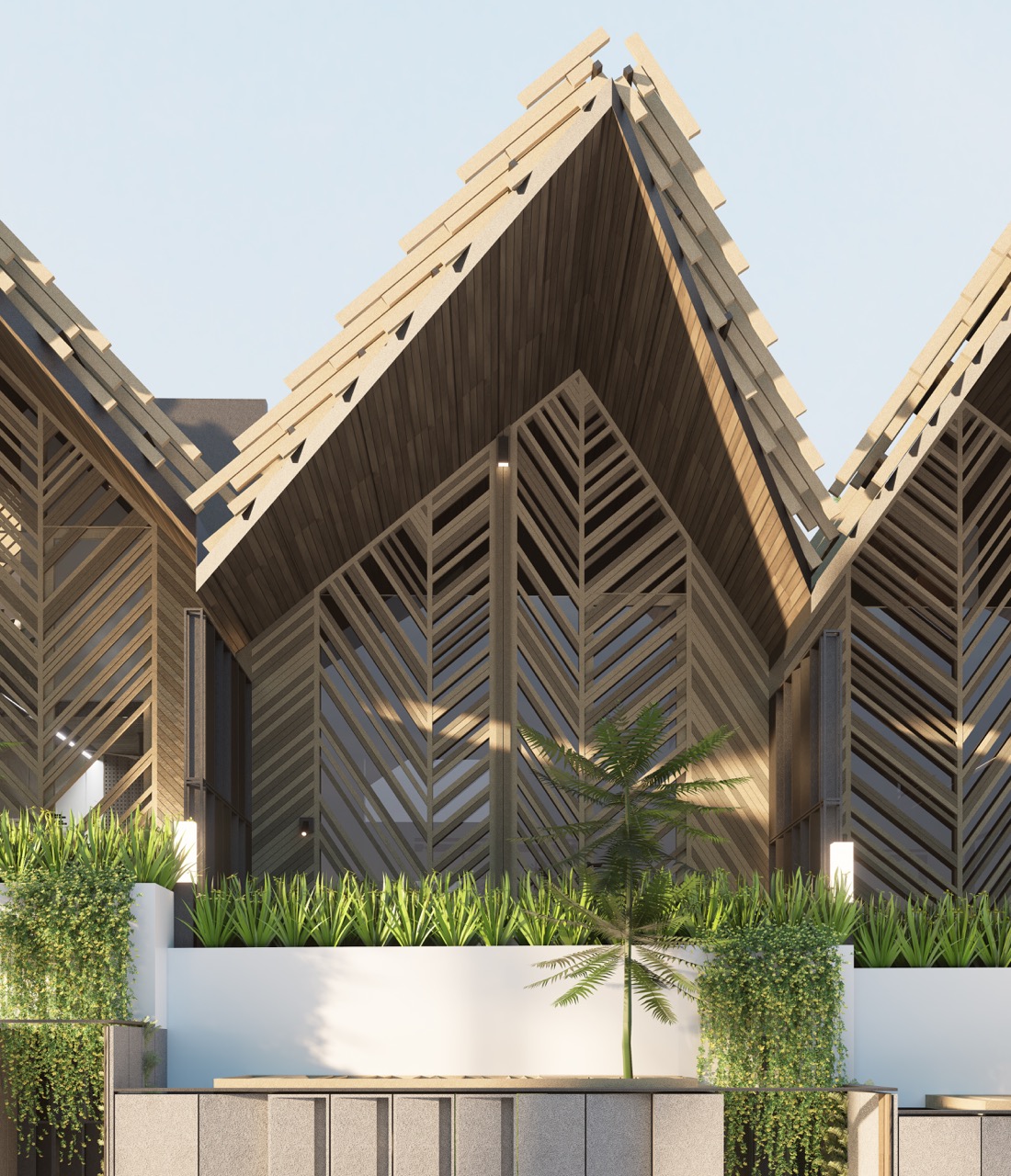 The villa includes a spacious main living area stretching up to 10 meters, encompassing the kitchen, dining, and sunken living areas. This connected space forms the heart of the villa, enhanced by wave like wooden ceilings that symbolize the wind and sea, evoking the essence of the tropics.