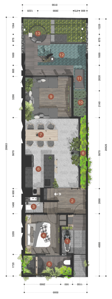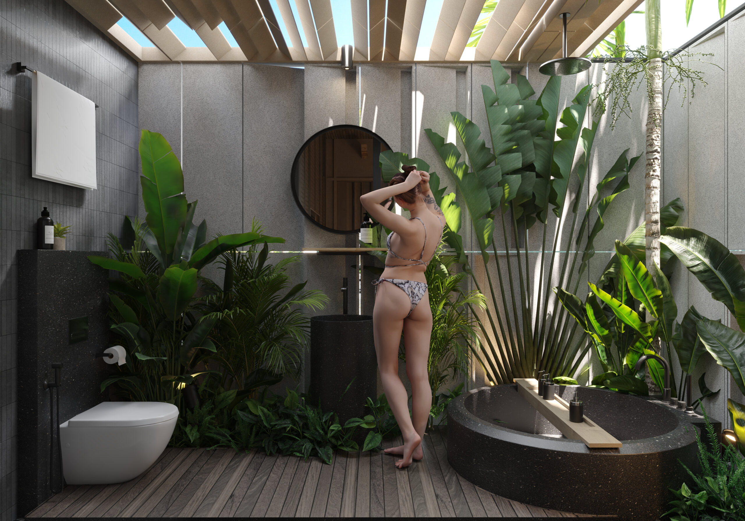 The first floor bathroom, supporting the guest room, features a “Garden Bathroom” concept that offers the sensation of bathing or soaking amid a vibrant tropical garden while maintaining complete privacy.