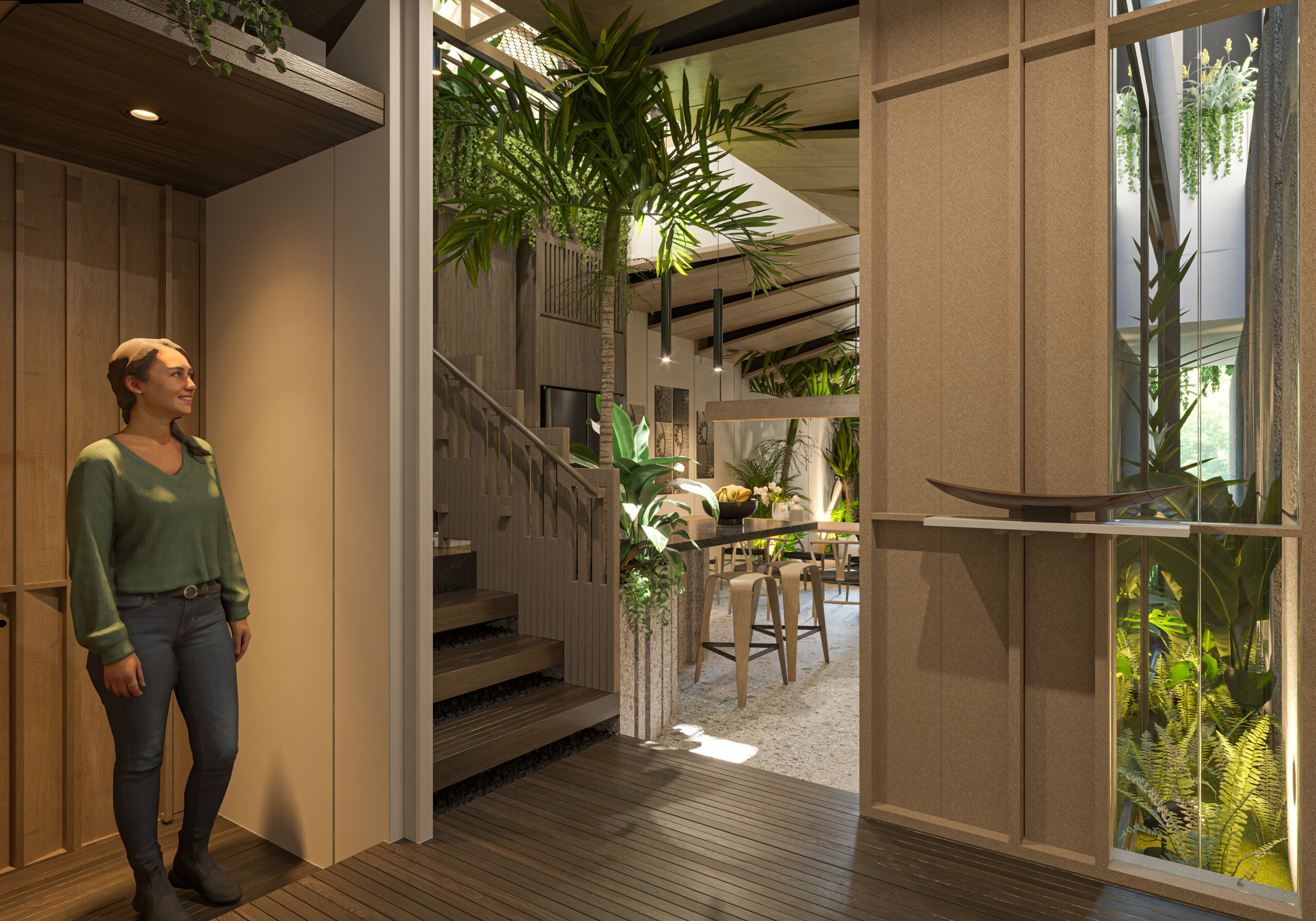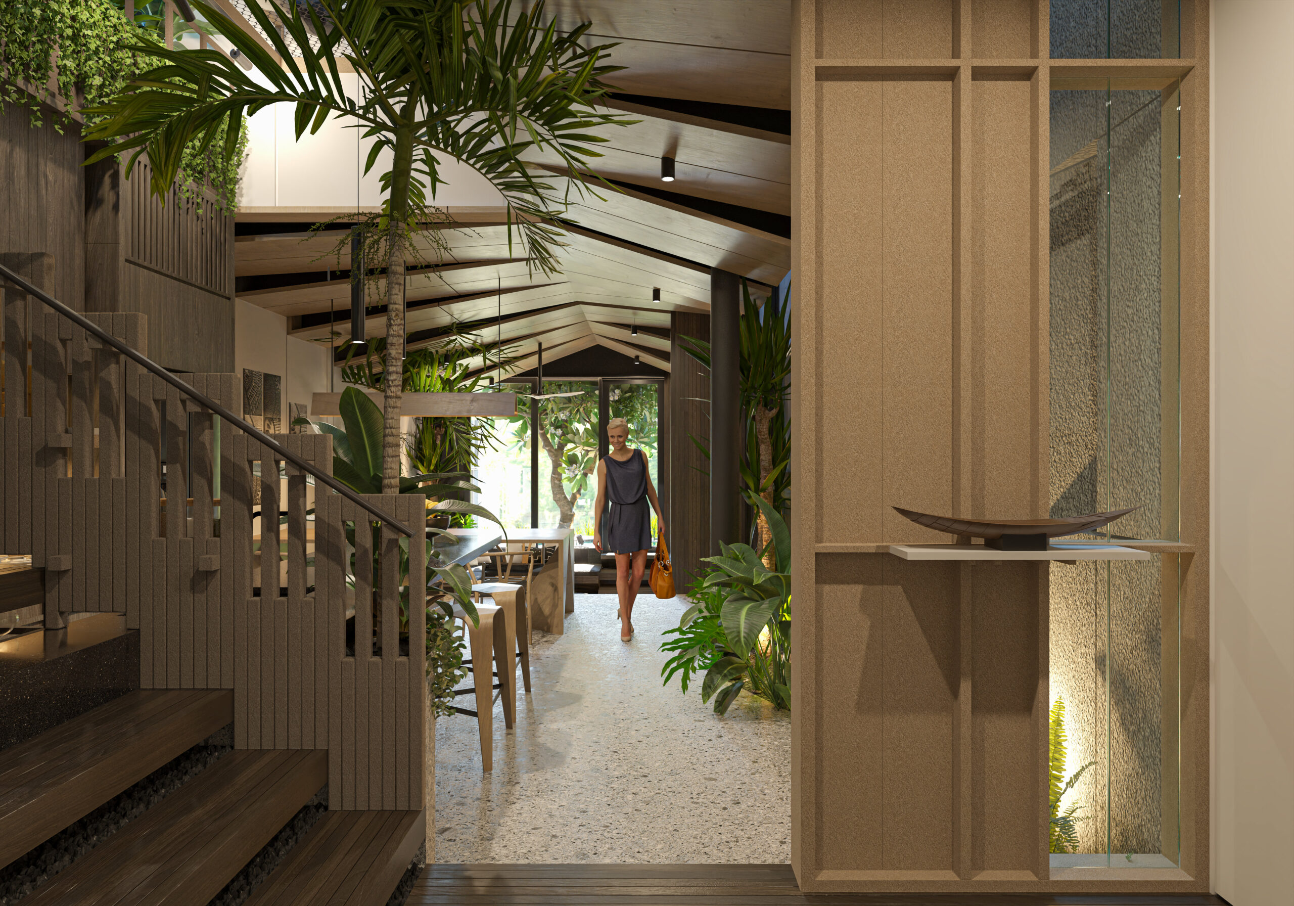 The villa features an entrance foyer with a tropical ambiance that warmly welcomes you upon arrival. This area connects directly to the main living area, guest bedroom, and powder room.