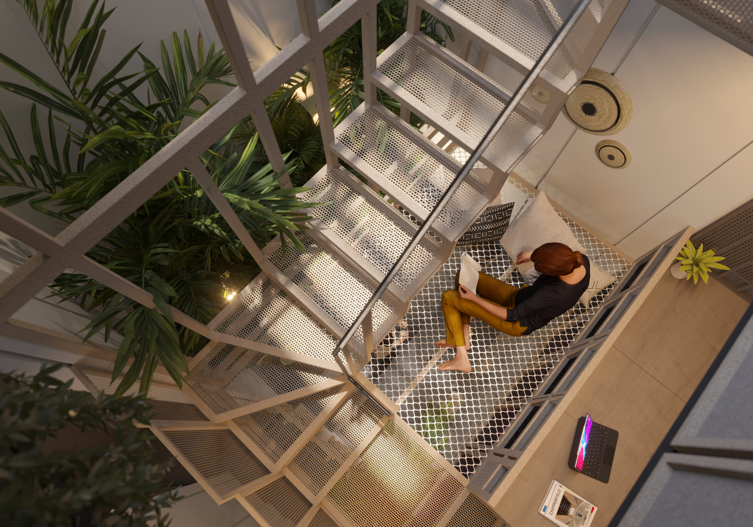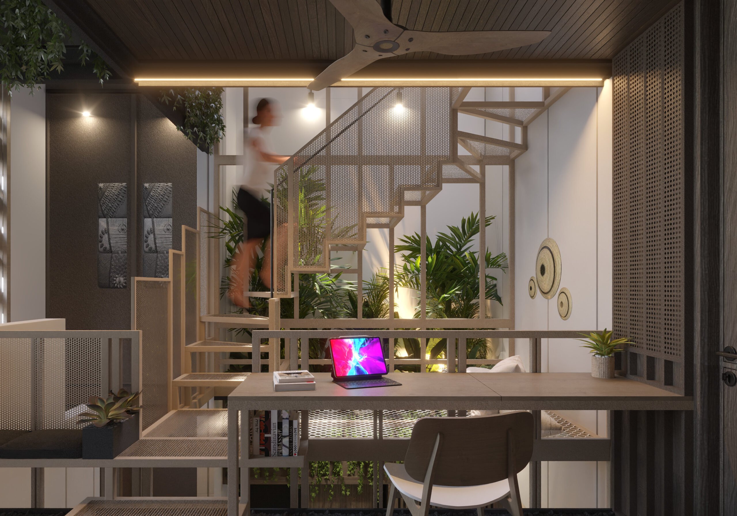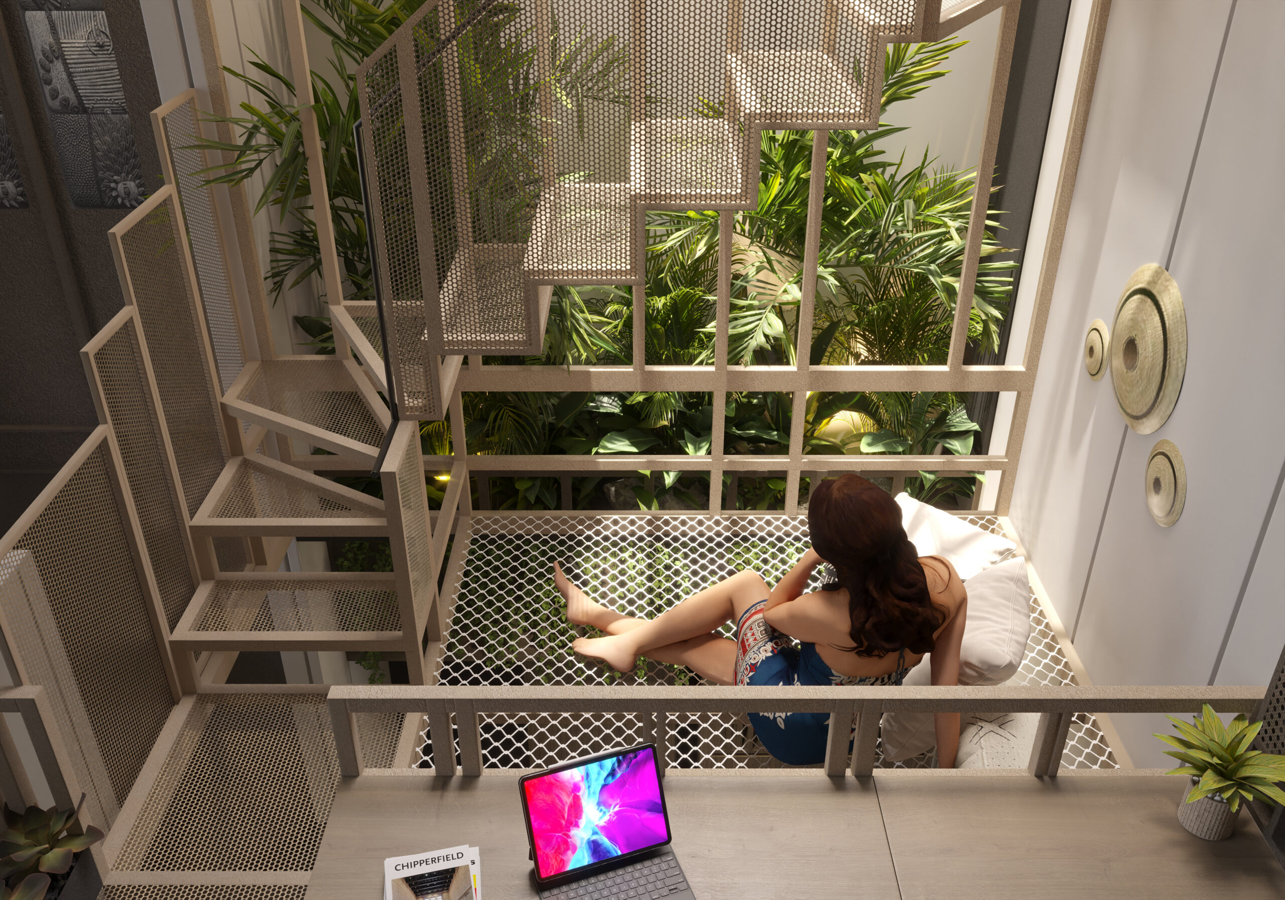 The villa’s “flying stairs” provide a striking architectural feature connecting the second floor to the rooftop deck. Constructed with perforated metal, they allow sunlight to filter through from the villa’s main skylight.