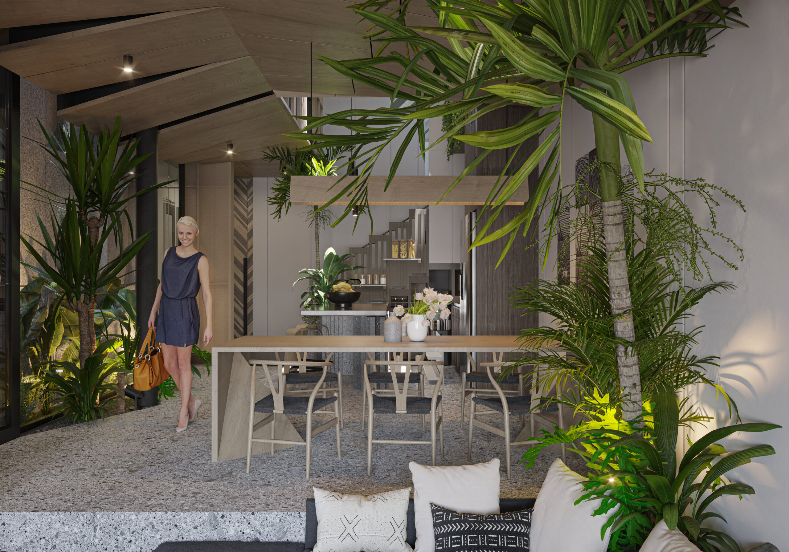 The villa is equipped with a modern kitchen and a wide island table, surrounded by tropical plants and seamlessly connected to the side garden. The island and floor are crafted from natural terrazzo stone, while the soaring 10 meter ceiling opens toward the sky creating an unforgettable tropical paradise experience.