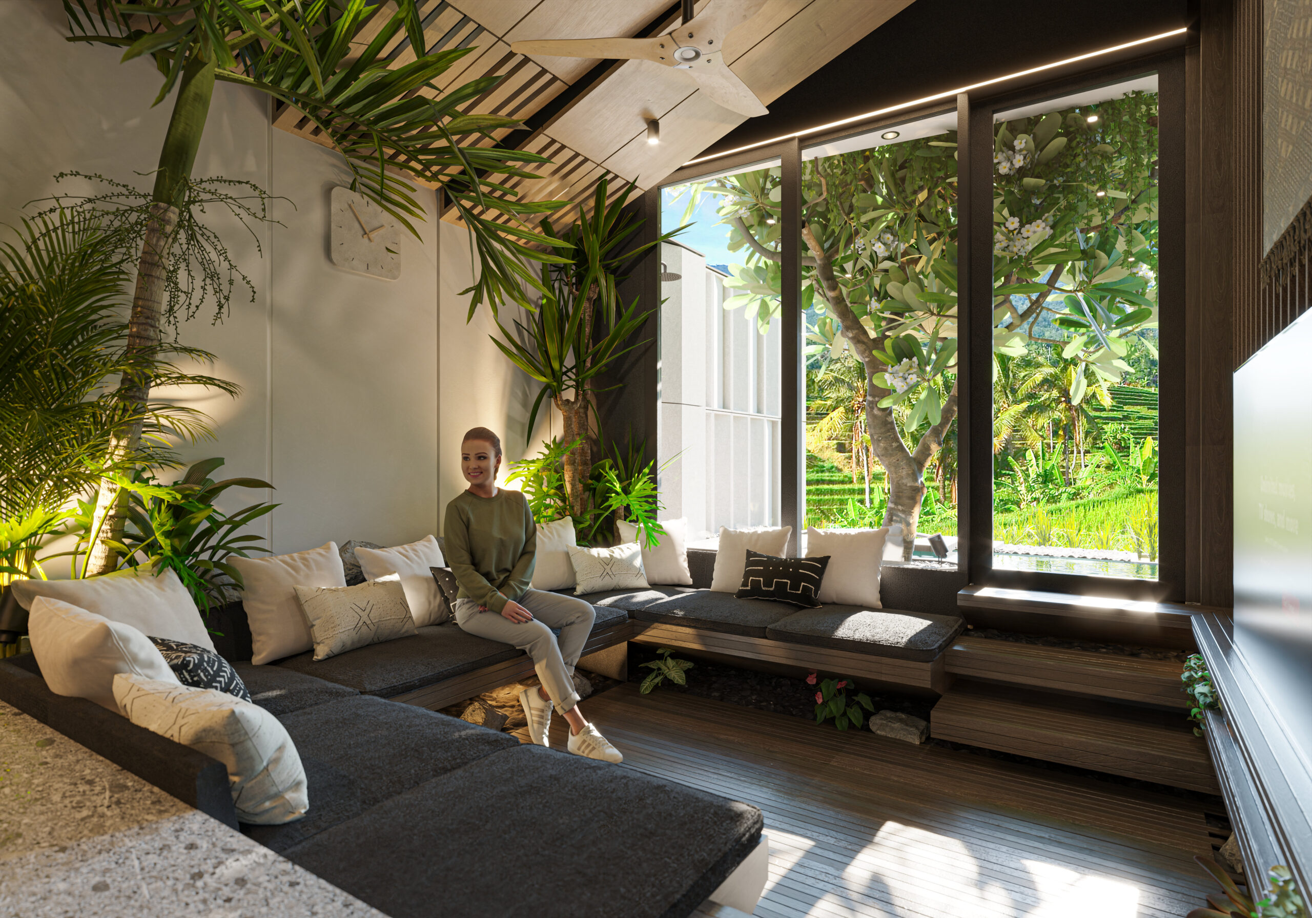 The villa features a sunken living area directly connected to the swimming pool and expansive rice field views. This inviting space is lined with plants and wooden elements, maximizing your tropical living experience.