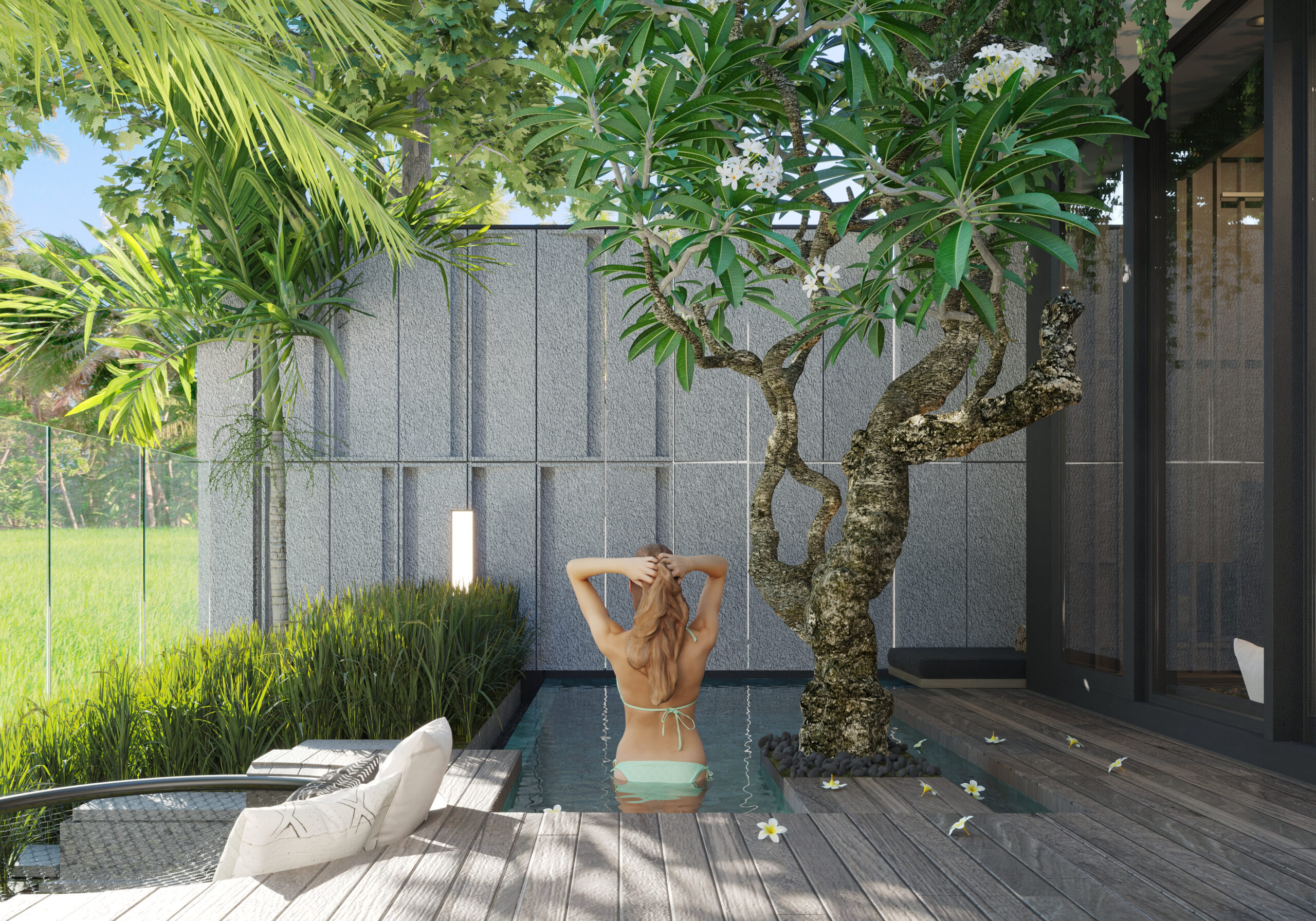 The master bathroom embraces an open “Translucent Bathroom” concept that preserves privacy while offering stunning views of the rice fields below and the sky above creating an indulgent, nature inspired bathing experience.