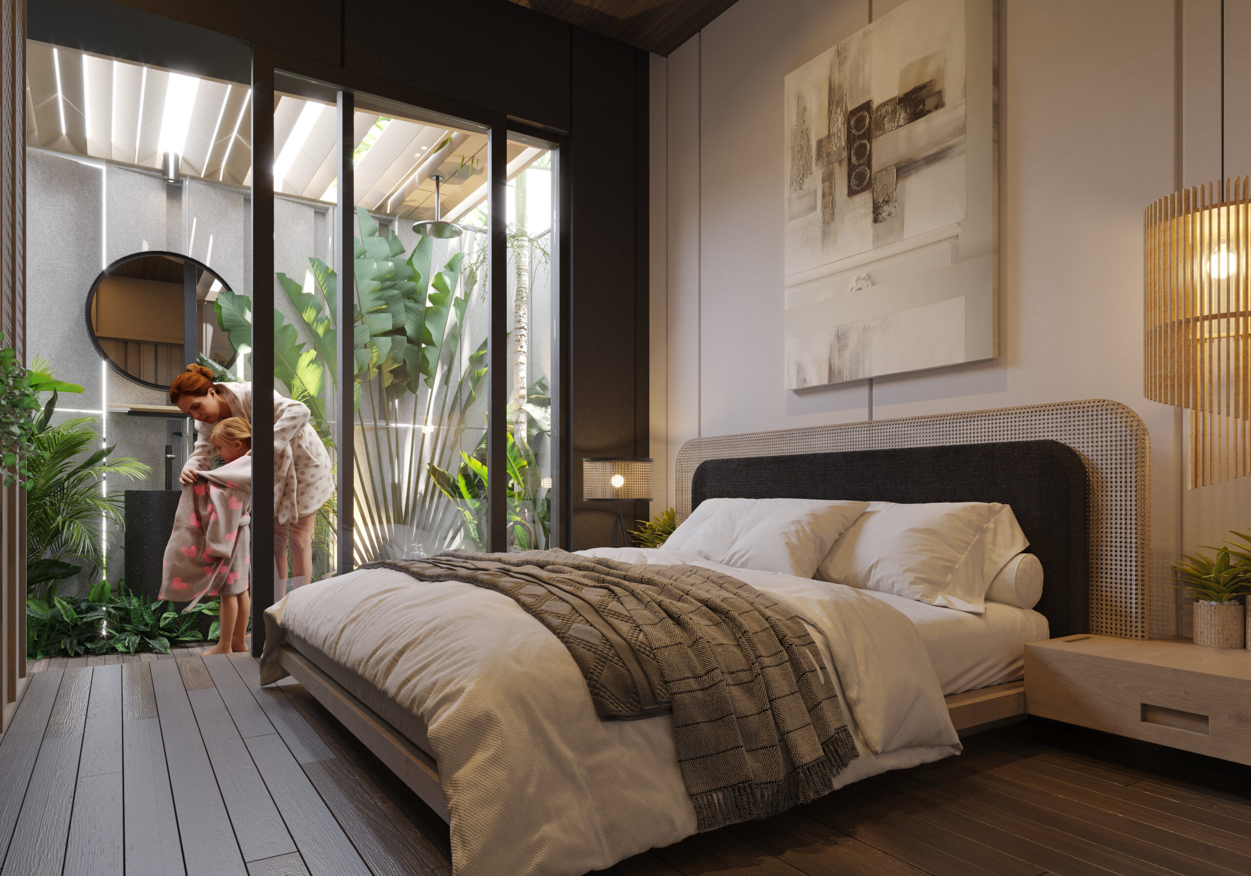 The villa’s master bedroom is designed as a sanctuary for unforgettable moments. Featuring a super king size bed, sofa, and 4 meter high ceiling adorned with tropical plant pots and a skylight above, this space embodies a truly remarkable tropical atmosphere.
