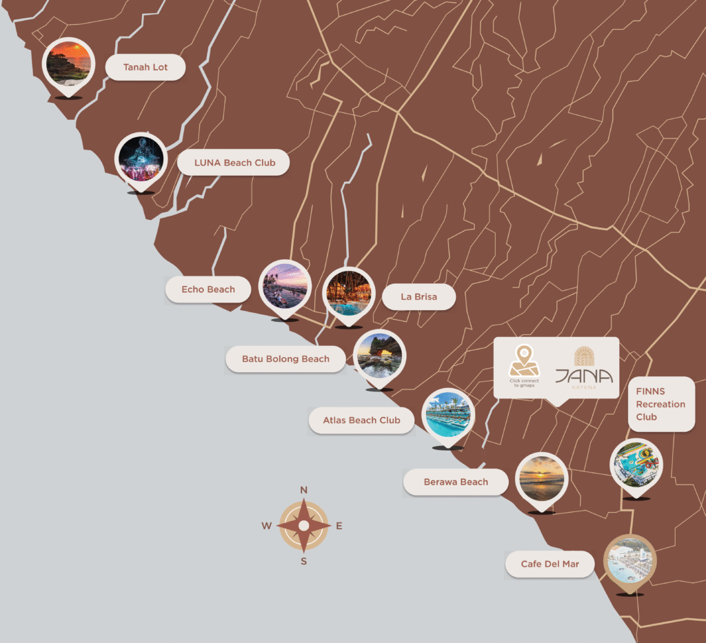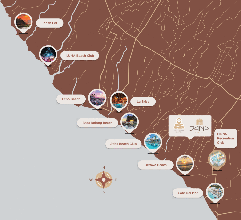 Considering that Canggu is the center of tourism in Bali at the moment, around JANA Kayana, there are various destinations and the best entertainment venues in Bali, starting from tourist destinations, beach clubs, beaches, spas & massages, coffee & eatery, as well as the best icons and landmarks on the island of the gods.